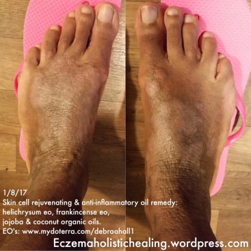 I got through this last trial of 2016 with encouragement from my mom, smiles and videos from my nieces, lots of rest, healing foods, supplements (extra probiotics and proteolytic enzymes) and essential oils. I stayed as hydrated as I could and kept my meals simple and yes, always vegan 😉. I used many essential oil remedies to get me through: the morphine bomb blend for pain and inflammation- a mix of lemongrass, marjoram, frankincense (added oregano oil for antibacterial/antibiotic effects) all in a veggie capsule (4 drops each) , I also used this same morphine bomb blend in a roller ball that I applied to the soles of my feet, I also applied frankincense by itself to take down the inflammation at night on the soles of my feet, I used an allergy capsule (for the itch) remedy of lemon, lavender and peppermint essential oils as well as diffusing these oils (4 drops each for the capsule and for the diffuser), I used oregano by itself for the oozing and took this every 6-8 hours (4 drops as well), later as the oozing and dried and crusted I started to apply a mix I did of helichrysum, frankincense, jojoba and coconut oil on my legs and feet. It was 2 drops of each EO to one large spoonful of each coconut & jojoba oils. This is pretty powerful as the helichrysum is super essential for skin renewal & localizing the blood flow to the skin and the frankincense is antioxidant rich and takes down the inflammation. I’ve found this mix to be very beneficial to my skin repairing through this flare and I’m going to continue to concentrate this mix on my feet for weeks to come. I didn’t take pictures throughout this flare, honestly I was just over it. I had no energy to document, although now I wish I had so you can see the day to day progression. The picture below is a week after my skin finally started feeling somewhat bearable (the day that I ventured out to go get groceries after literally rationing food).