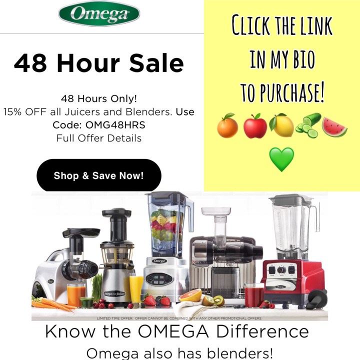 Omega Juicers have a 15% off sale going on until January 20, @ 11:59PM! Make sure to take advantage of this awesome sale! I personally have the Omega vsj843r slow masticating juicer and I LOVE it! πππππ₯ The clean up is easy and the juice comes out super smooth and pure! Click on the link above and make sure to use the discount code: OMG48HRS π