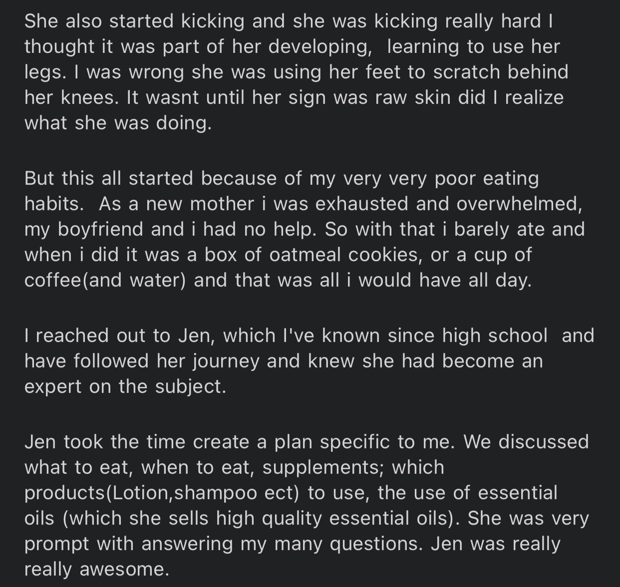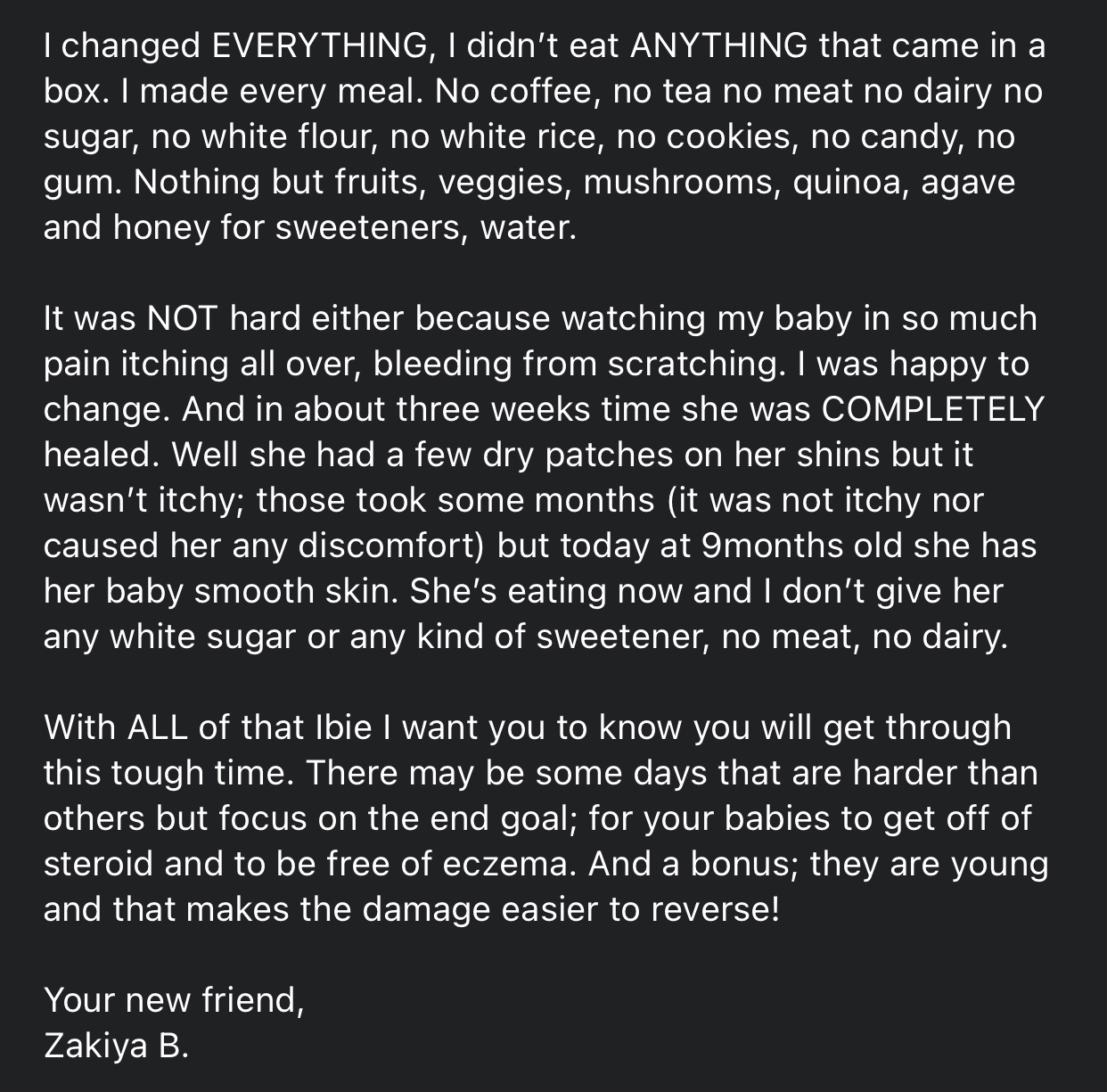 You can scroll through to see her story and photos. She didn’t have many before photos, but the one that is shared you can see different discoloured patches on her belly. Zakiya was so gracious to send an email of support to another mother named Ibie who I’m helping with her two children experiencing eczema as well. I hope Reneè’s testimony can give you hope about healing baby eczema 🌸